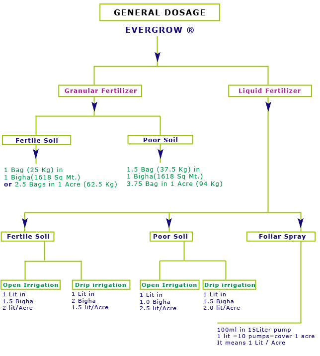 Foliar spray: Dilute 1 Lit of liquid evergrow in 100 Lit of water Note: For 1 acre about 1 Lit of evergrow is required for each time. |